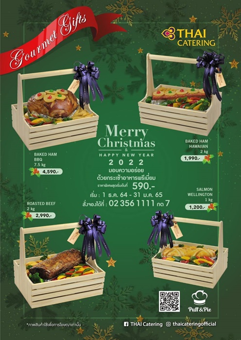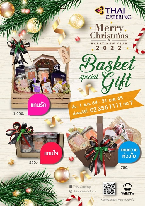 ผู้สนใจสามารถสอบถามข้อมูลเพิ่มเติม หรือสั่งจองกระเช้าล่วงหน้า 3 วัน ที่หมายเลขโทรศัพท์ 0-2356-1111 กด 7 ได้ตั้งแต่บัดนี้ - 31 ม.ค. 2565 ทุกวัน เวลา 08.00 - 17.00 น. หรือดูรายละเอียดเพิ่มเติมได้ที่เว็บไซต์ thaicatering.com และ puffandpie.com![]()