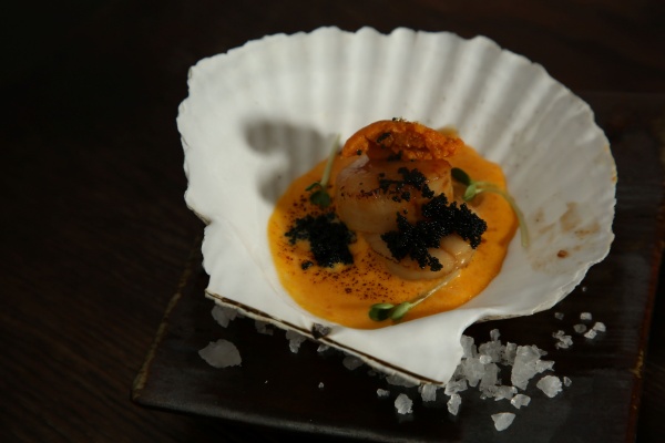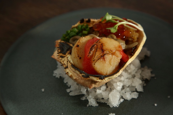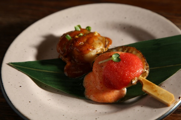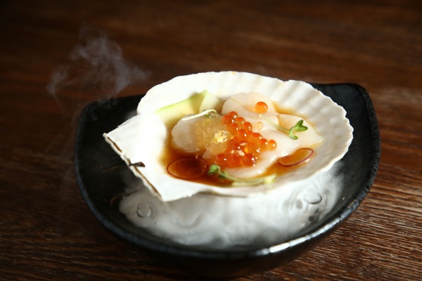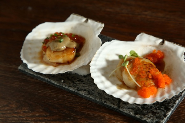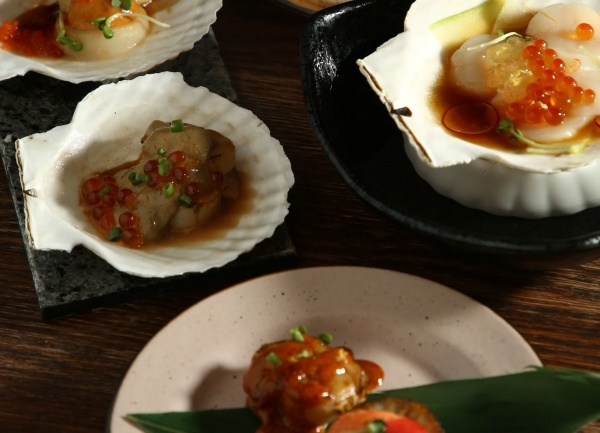 เริ่มที่ Hotate Yuzu Carpaccio ออเดิร์ฟเปิดหัวด้วยสลัดสไตล์ยุโรป ผสมกับหอยฮอกเกโดโฮตาเตะ ที่ร้านสไตล์ยุโรปในญี่ปุ่นนิยมเสิร์ฟกัน โดยเป็นเมนูที่คนญี่ปุ่นรู้จักกันอย่างดีจะให้ความรู้สึกที่เบา มีรสชาติเปรี้ยวนิด ๆ กระตุ้นต่อม เพิ่มความอยากอาหาร เลือกใช้ยูซุ เพิ่มมิติให้มีรสชาติเปรี้ยวหอมเป็นเอกลักษณ์บ่งบอกความเป็นญี่ปุ่น ท็อปด้วยอิคุระเกรดดี Hotate Lobster & Kani Miso Yaki เมนูพิเศษที่สร้างสรรค์ขึ้นใหม่ โดยประกอบด้วยคานิมิโซะ ล็อบสเตอร์มิโซะ เอามาปรับรสชาติให้เบาลงหน่อย ทานคู่กับโฮตาเตะท็อปปิ้งด้วยไข่ปลาแซลมอน Hotate Duo Kushiyaki เมนูนี้ได้รับแรงบันดาลใจจาก Izakaya หรือ ร้านดื่มสไตล์ญี่ปุ่น เมนูส่วนใหญ่จะเน้นสะดวก ทานคู่กับเครื่องดื่มของญี่ปุ่นได้อย่างกลมกลืน มี 2 รสชาติคือเมนูชื่อดังจากเกาะฟุคุโอกะ Hotate Mentaiko Kushiyaki หอยโฮตาเตะย่างแล้วท็อปด้วยซอสเมนไทโกะ เมนูที่ 2 คือ Hotate Mala (หม่าล่า) เมนูนี้ถูกประยุกต์จากเมนูที่คนไทยนิยม ทำเป็นซอสหม่าล่า ทานคู่กับโฮตาเตะ รสชาติเข้ากันได้เป็นอย่างดี Fried Truffle Cream Udon เมนูนี้ได้แรงบันดาลใจจากเมนูอาหารฝรั่งจากร้านอาหารฝรั่งในเมืองใหญ่ ๆ อย่างโตเกียว, โอซาก้า, โกเบ โดยจะเลือกใช้เห็ดทรัฟเฟิล นำมาประยุกต์เข้ากับวัตถุดิบ หอยโฮตาเตะ ทำเป็นเมนูโฮตาเตะคัตซึ กรอบนอก เนื้อด้านในหวานฉํ่า ทานคู่กับทรัฟเฟิลซอส