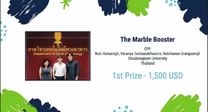 บริษัท เจริญโภคภัณฑ์อาหาร จำกัด (มหาชน) หรือ ซีพีเอฟ ถ่ายทอดประสบการณ์ด้านอาหาร หนุนนิสิตจุฬาลงกรณ์มหาวิทยาลัย คว้ารางวัลชนะเลิศการแข่งขันนวัตกรรมอาหารจากพืช ระดับภูมิภาคอาเซียนปี 2564 (Asean Food Innovation Challenge 2021) สนับสนุนนักวิจัยรุ่นใหม่ พัฒนานวัตอาหารเพื่อสุขภาพรับเทรนด์อาหารในอนาคตซีพีเอฟ จับมือ ProVeg Asia ร่วมสนับสนุนและให้คำปรึกษา (Coaching) แก่นักวิจัยรุ่นใหม่ เพื่อพัฒนานวัตกรรมอาหารในอนาคต 2 ทีม คือ ทีม Food Tech Chula จากแนวคิดนวัตกรรมอาหาร “The Marble Booster” ซึ่งได้รับรางวัลชนะเลิศ และทีม TempMie จากประเทศอินโดนีเซีย ได้อันดับที่ 2 นำเสนอแนวคิด “Asean Fusion yet Functional Food” ภายใต้เป้าหมายที่ซีพีเอฟกำหนด คือ การพัฒนานวัตกรรมอาหารที่มาจากพืช “Plant-based Innovation” มีผลงานทีส่งเข้าร่วมแข่งขัน 125 ชิ้น จากมหาวิทยาลัย 54 แห่ง ใน 13 ประเทศ ดร.ลลนา ธีระนุสรณ์กิจ รองกรรมการผู้จัดการอาวุโส ด้านนวัตกรรมอาหารและการพัฒนาผลิตภัณฑ์ใหม่ ซีพีเอฟ กล่าวว่า ทั้งสองทีมมีความมุ่งมั่นสูงและรับฟังคำแนะนำจากทีมเมนเตอร์เป็นอย่างดี สามารถนำคำแนะนำที่ได้รับไปต่อยอดได้อย่างรวดเร็ว และประยุกต์ใช้ได้เหมาะสมเพื่อการผลิตผลงานได้จริงในอนาคต ในส่วนของทีม Food Tech Chula ที่คว้ารางวัลชนะเลิศ เป็นทีมที่มีการประสานความเชี่ยวชาญของแต่ละคนได้อย่างลงตัว นำเสนอแนวคิดนวัตกรรมเนื้อเทียม The Marble Booster ได้อย่างสร้างสรรค์ และมีคุณสมบัติพิเศษในการสร้างภูมิคุ้มกันของร่างกาย
