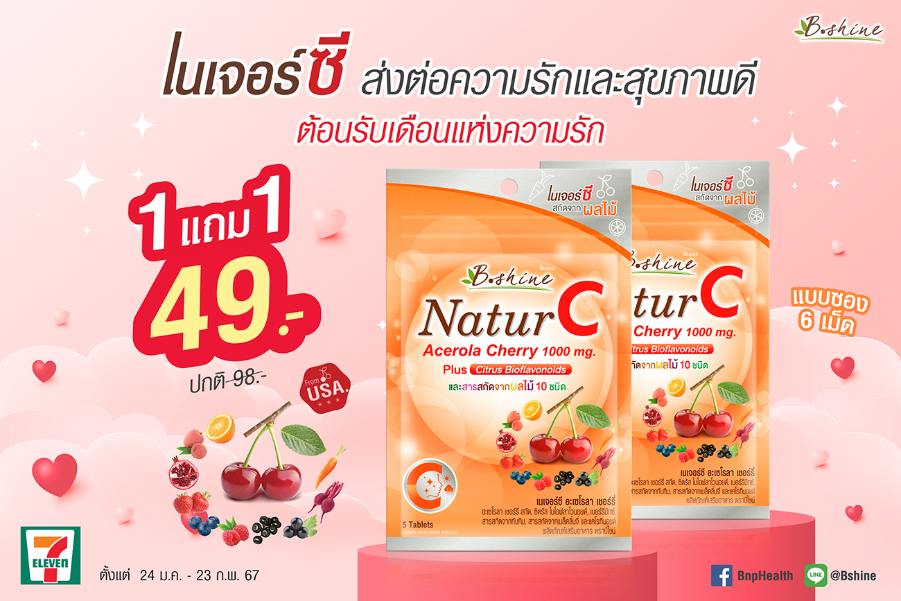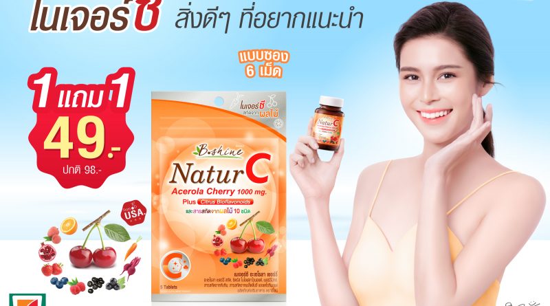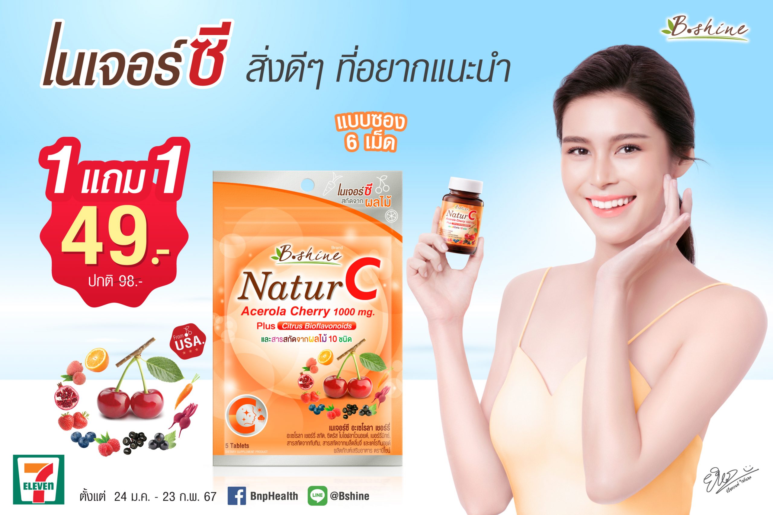 “บีไชน์ เนเจอร์ซี” (B Shine NaturC) วิตามินซีจากธรรมชาติ อะเซโรลา เชอร์รี่ สกัดเข้มข้น จากสหรัฐอเมริกา วิตามินซีมีส่วนช่วยในการทำหน้าที่ตามปกติของระบบภูมิคุ้มกัน มีส่วนช่วยในการสร้างคอลลาเจนเพื่อการทำงานตามปกติของผิวหนัง และมีส่วนช่วยในกระบวนการต่อต้านอนุมูลอิสระ ผสานคุณประโยชน์ของผลไม้สกัด ที่อุดมไปด้วยไฟโตนิวเทรียนท์และสารต้านอนุมูลอิสระประสิทธิภาพสูง ให้ผิวสวยใส สุขภาพดี “บีไชน์ เนเจอร์ซี” เป็นวิตามินซีธรรมชาติ 100% จึงสามารถดูดซึมเข้าสู่ร่างกายได้ดี และคงอยู่ในร่างกายได้นาน ไม่ระคายเคืองกระเพาะอาหาร ทั้งยังมีซิตรัสไบโอฟลาโวนอยด์ในปริมาณสูงที่มีคุณสมบัติช่วยเพิ่มการดูดซึมวิตามินซีเข้าสู่ร่างกายให้ดียิ่งขึ้น บีไชน์ เนเจอร์ซี แบบเม็ด ทานง่าย ไม่มีสารตกค้างในร่างกาย