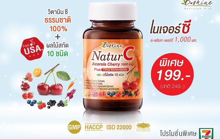 บริษัท บีไชน์ นูทริชั่น พลัส จำกัด ขอแนะนำ “บีไชน์ เนเจอร์ซี” วิตามินซีธรรมชาติจาก อะเซโรลา เชอร์รี่ สกัด 1000 มก./เม็ด และยังผสานคุณค่าสารสกัดจากผลไม้ถึง 10 ชนิด จากสหรัฐอเมริกา อุดมไปด้วยไฟโตนิวเทรียนท์ ดีต่อผิวและสุขภาพ โดยวิตามินซีจะเสริมภูมิต้านทานและช่วยบรรเทาอาการภูมิแพ้ ลดความรุนแรงและระยะเวลาการเป็นหวัด ช่วยให้ร่างกายแข็งแรง และสร้างคอลลาเจนให้ผิว
