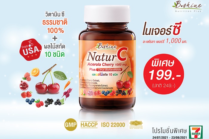“บีไชน์ เนเจอร์ซี” ไม่ระคายเคืองกระเพาะอาหาร รับประทานวันละ 1 เม็ด ขนาดบรรจุขวดละ 30 เม็ด แถมฟรีอีก 5 เม็ดในขวด พิเศษกับโปรโมชั่นราคาเพียงขวดละ 199 บาท จากปกติ 249 บาท เริ่มตั้งแต่วันนี้ – 23 สิงหาคม 2564 ที่เซเว่นอีเลฟเว่นทุกสาขาทั่วประเทศ
