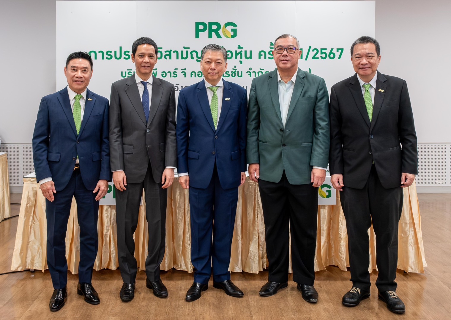 นายสุเวทย์ ธีรวชิรกุล รองประธานกรรมการ (ที่ 3 จากซ้าย) พร้อมด้วย นายวิจักษณ์ ประดิษฐวณิช กรรมการ (ที่ 5 จากซ้าย) นายไกรวิน ศรีไกรวิน กรรมการ (ที่ 2 จากซ้าย) นายเกษมสุข จงมั่นคง กรรมการ(ที่ 4 จากซ้าย) และ นายสมเกียรติ มรรคยาธร กรรมการผู้จัดการใหญ่(ที่ 4 จากซ้าย) นำทีมคณะกรรมการ และคณะผู้บริหารระดับสูง บริษัท พี อาร์ จี คอร์ปอเรชั่น จำกัด (มหาชน) ผู้บริหารกลุ่มธุรกิจในเครือข้าวมาบุญครอง ศูนย์อาหารฟู้ด เลเจ้นด์ส และริเวอร์เดล มารีน่า จัดการประชุมวิสามัญผู้ถือหุ้น ครั้งที่ 1/2567 เพื่อพิจารณา และอนุมัติแผนการดำเนินงานให้ธุรกิจเติบโตอย่างยั่งยืน ในรูปแบบการจัดประชุมผ่านสื่ออิเล็กทรอนิกส์ ณ ห้องสัมมนา ชั้น 8 ศูนย์การค้าเอ็ม บี เค เซ็นเตอร์ เมื่อเร็ว ๆ นี้