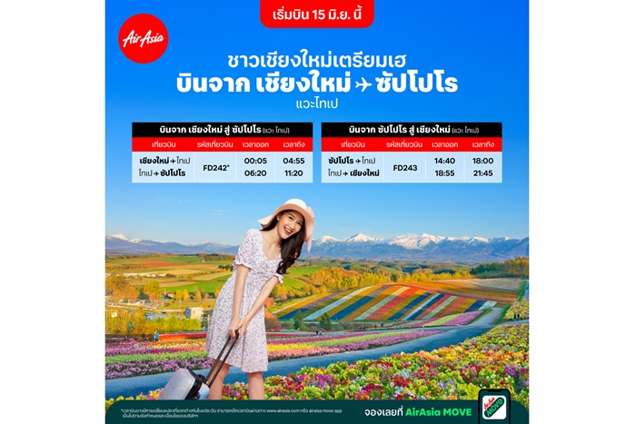 กรุงเทพฯ วันที่ 25 มีนาคม 2568 – ไทยแอร์เอเชียใช้สิทธิทางการบินที่ 5 หรือ Fifth Freedom เปิดเส้นทางบินใหม่ล่าสุด เชียงใหม่ – ไทเป – ซัปโปโร โดยเที่ยวบินจะบินตรงจากเชียงใหม่ พร้อมแวะรับส่งผู้โดยสารที่ไทเป สู่ปลายทางญี่ปุ่น ที่เมืองซัปโปโร ให้บริการ 7 เที่ยวบินต่อสัปดาห์ ด้วยเครื่องบินแอร์บัส A320 พร้อมให้บริการเที่ยวบินแรกวันที่ 15 มิถุนายน 2568