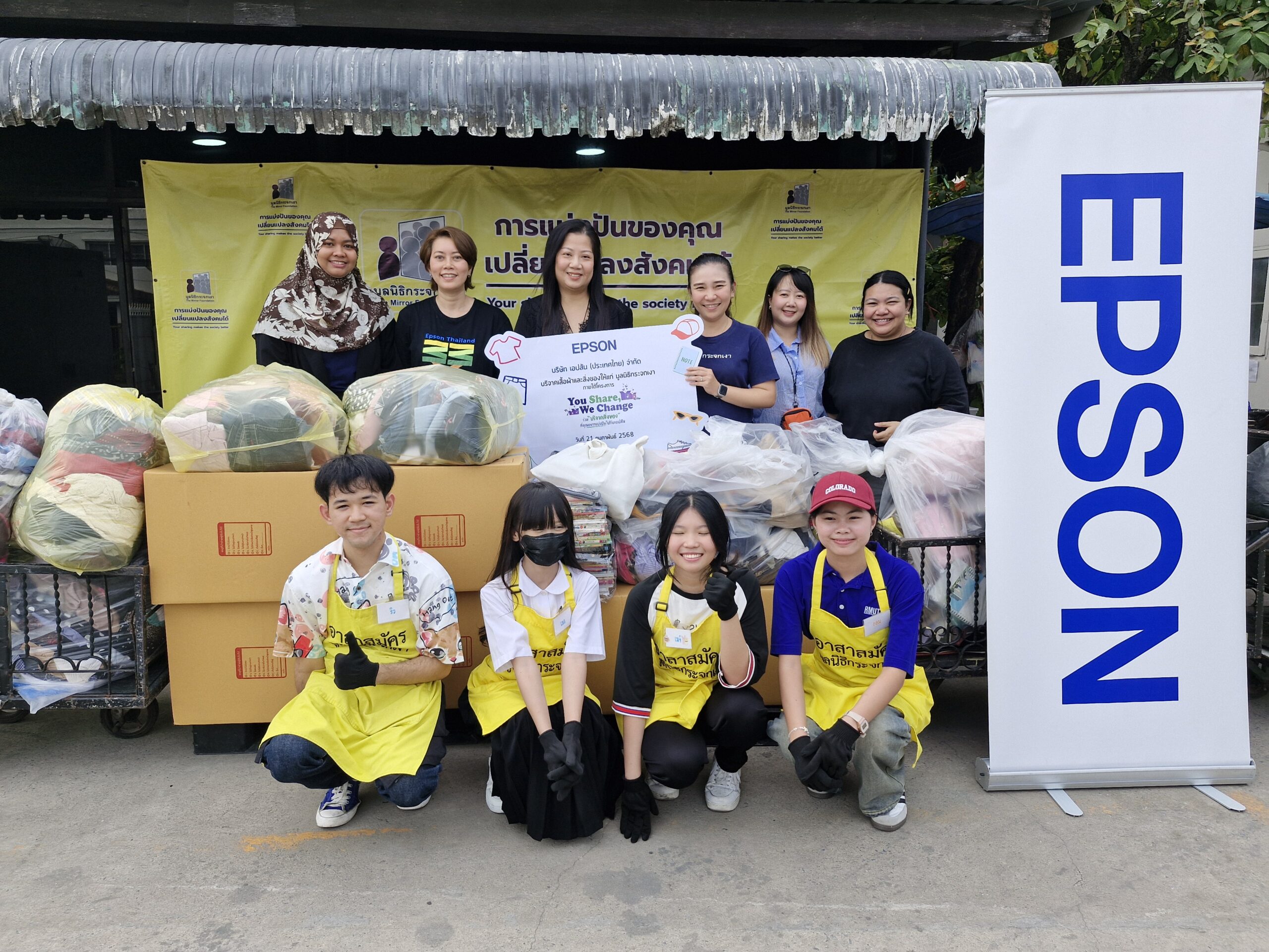 กิจกรรมแรก เอปสันได้นำสิ่งของที่ได้รับการบริจาคสิ่งของที่ยังอยู่ในสภาพดี จากพนักงานเอปสัน รวมถึงผู้ที่ทำงานที่อาคารปัน ซึ่งรวบรวมผ่านกิจกรรม “You Share, We Change ปีที่ 2” มอบให้แก่ มูลนิธิกระจกเงา เพื่อส่งต่อให้เกิดการใช้งานต่อไป ซึ่งกิจกรรมนี้เป็นส่วนหนึ่งของการส่งเสริมการใช้ทรัพยากรอย่างคุ้มค่า ลด ปริมาณขยะ และลดผลกระทบต่อสิ่งแวดล้อม