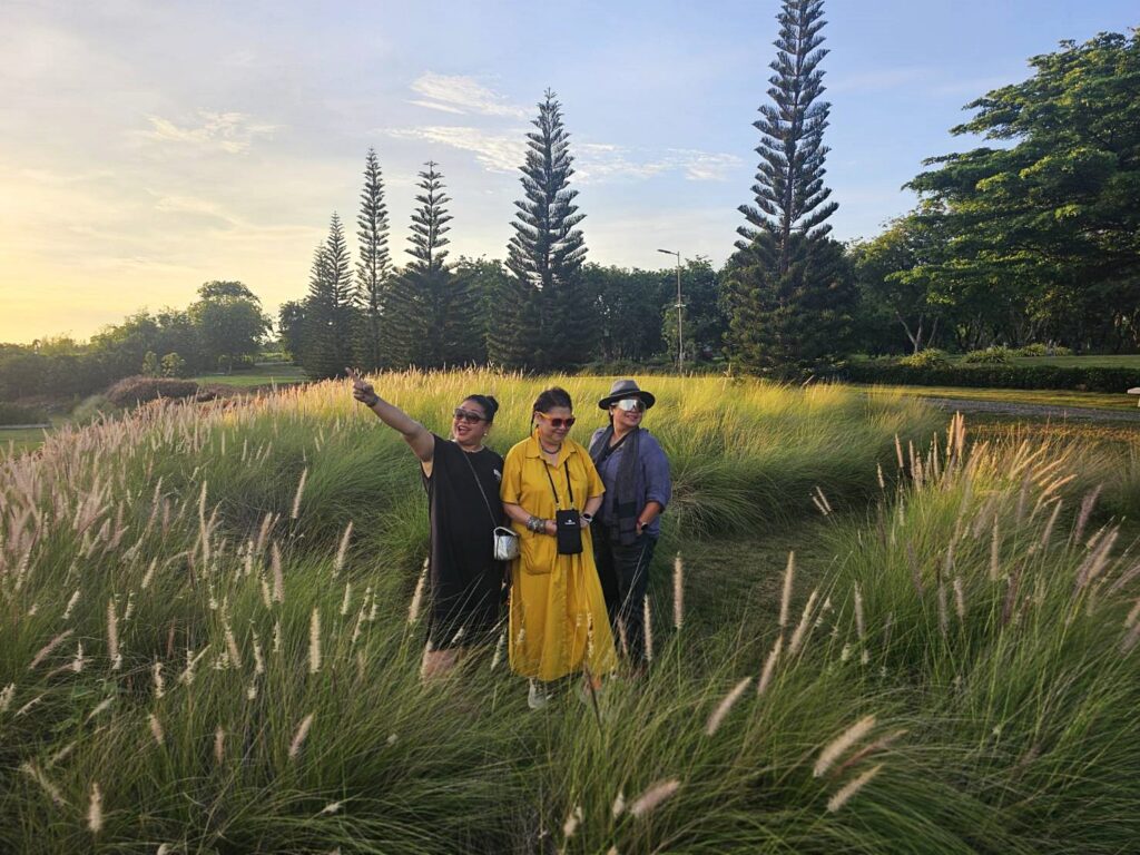 .. ตั้งแต่ล้อหมุนเข้าสู่ประตูรั้วทางเข้า “ ผาย้อนตะวัน “ ที่เราเห็นก็ทำให้เกิดอาการว้าว ! กันแล้ว กับหมู่มวลต้นมะขามที่ถูกปลูกจัดแต่งเรียงรายอย่างเป็นระเบียบ เว้นระยะกันอย่างน่ามอง ขณะที่ต้นหญ้าด้านล่างก็เขียวสดจนแทบอยากจะกระโดดลงไปนอนเกลือกกลิ้ง