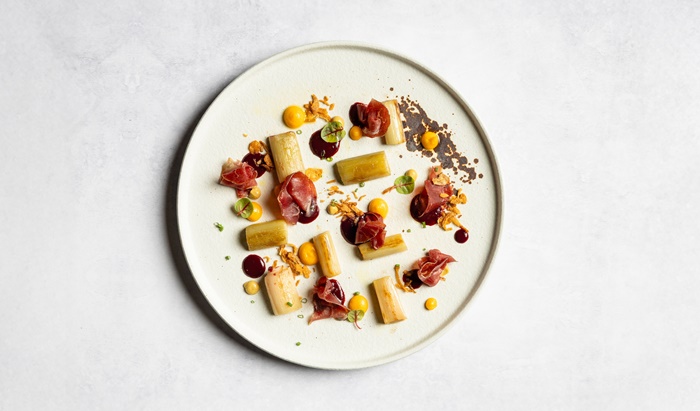 1. Slow-Cooked and Grilled Leek with Cecina and Cherry Coulis