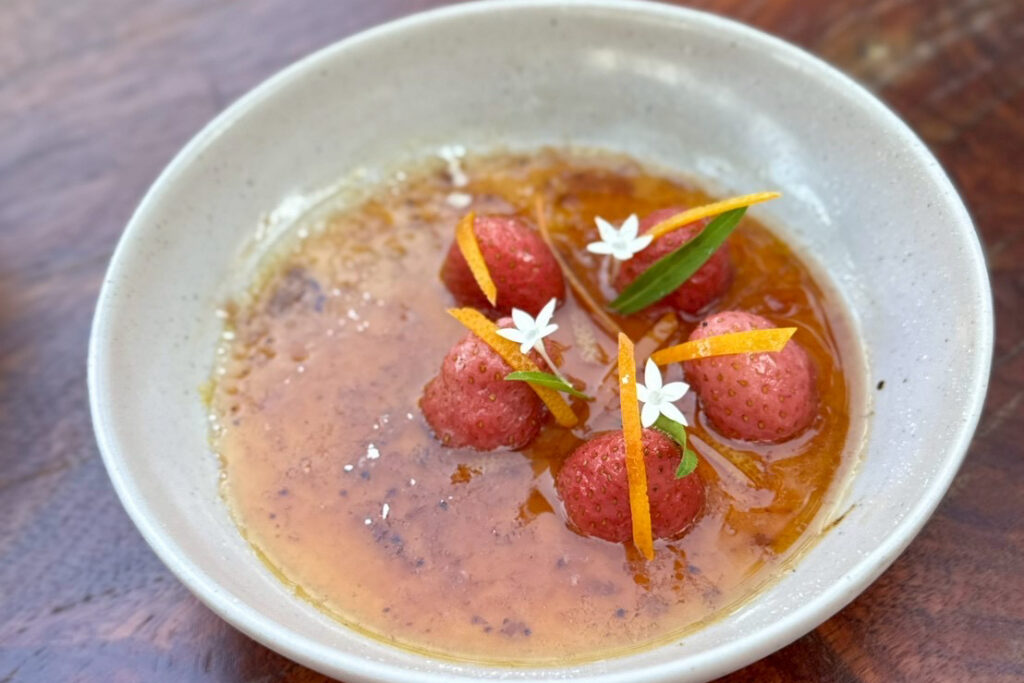 ปิดท้ายค่ำคืนแห่งความหวานด้วยของหวานแสนละมุน Strawberry Crème Brûlée เสิร์ฟพร้อมซอสสตรอว์เบอร์รี ส้มดอง และคาราเมลกรอบ เพิ่มความประทับใจให้ค่ำคืนพิเศษของคุณสมบูรณ์แบบยิ่งขึ้น