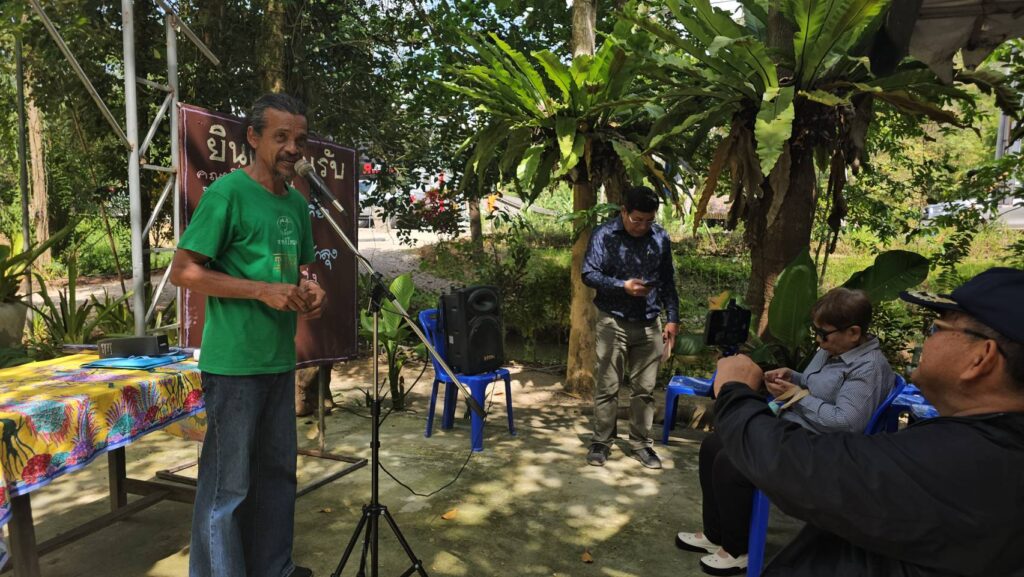 อ.เจน สงสมพันธ์ ประธานกรรมการ “หลาดใต้โหนด” ตั้งโต๊ะให้การต้อนรับคณะ พร้อมกับเล่าถึงความเป็นมาของหลาดใต้โหนดว่า “ เป็นโครงการ บ้านนักเขียน โดย กนกพงศ์ สงสมพันธุ์ นักเขียนรางวัลซีไรท์จากรวมเรื่องสั้น แผ่นดินอื่น เมื่อปี 2539 ซึ่งเสียชีวิตเมื่อปี 2549 ส่วนโครงการนี้ตั้งอยู่บนพื้นที่ประมาณสิบไร่ เป็นที่นาเก่าที่ทิ้งรกร้างมากว่ายี่สิบปี ปี 2558 เพิ่มโครงการตลาดเพื่อชุมชน