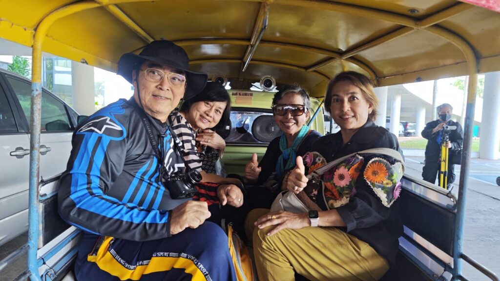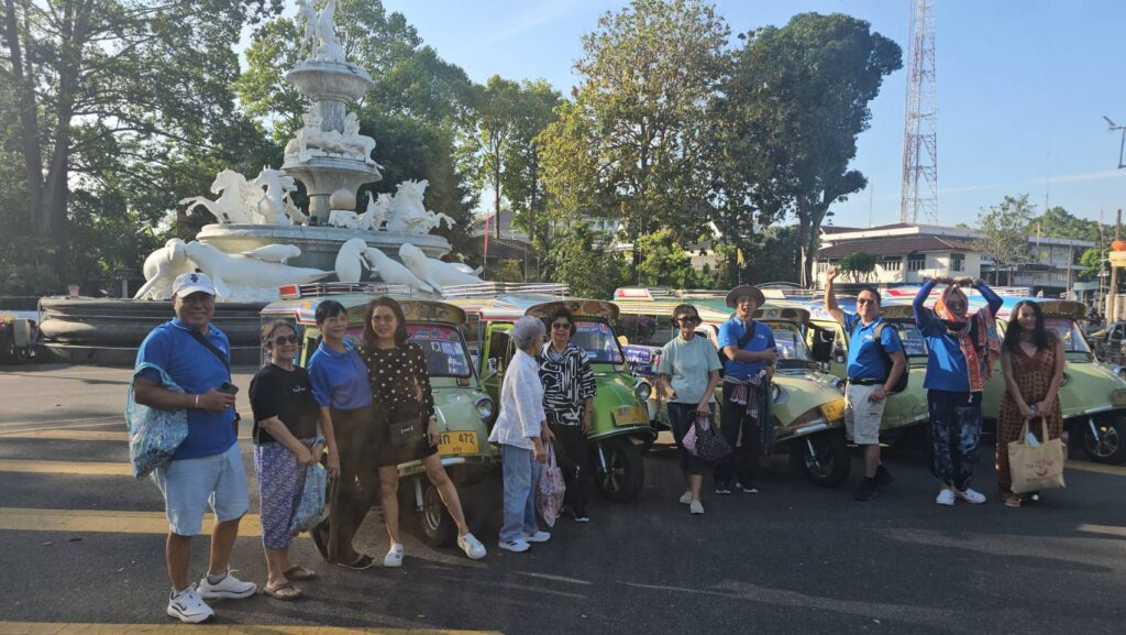 มาตรังก็หลายครั้ง ไม่ได้มีโอกาสนั่งรถตุ๊กตุ๊กหัวกบกับเขาเสียที คราวนี้มากรุ๊ปใหญ่ ทางชสท.และททท.ตรังจัดให้ โดยจัดกระบวนแถวกันมารับถึงบันไดหน้าโรงแรมเรือรัษฎา ตรัง รถตุ๊กตุ๊กหัวกบ จำนวนยี่สิบกว่าคันเรียงรายรอรับคณะ ที่กระโดดขึ้นบ้าง ปีนขึ้นบ้าง ถัดขึ้นบ้าง (ตามวัย) เรียกเสียงเฮฮาตั้งแต่รถยังไม่ทันเคลื่อนขบวน