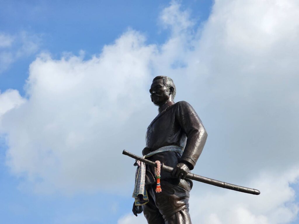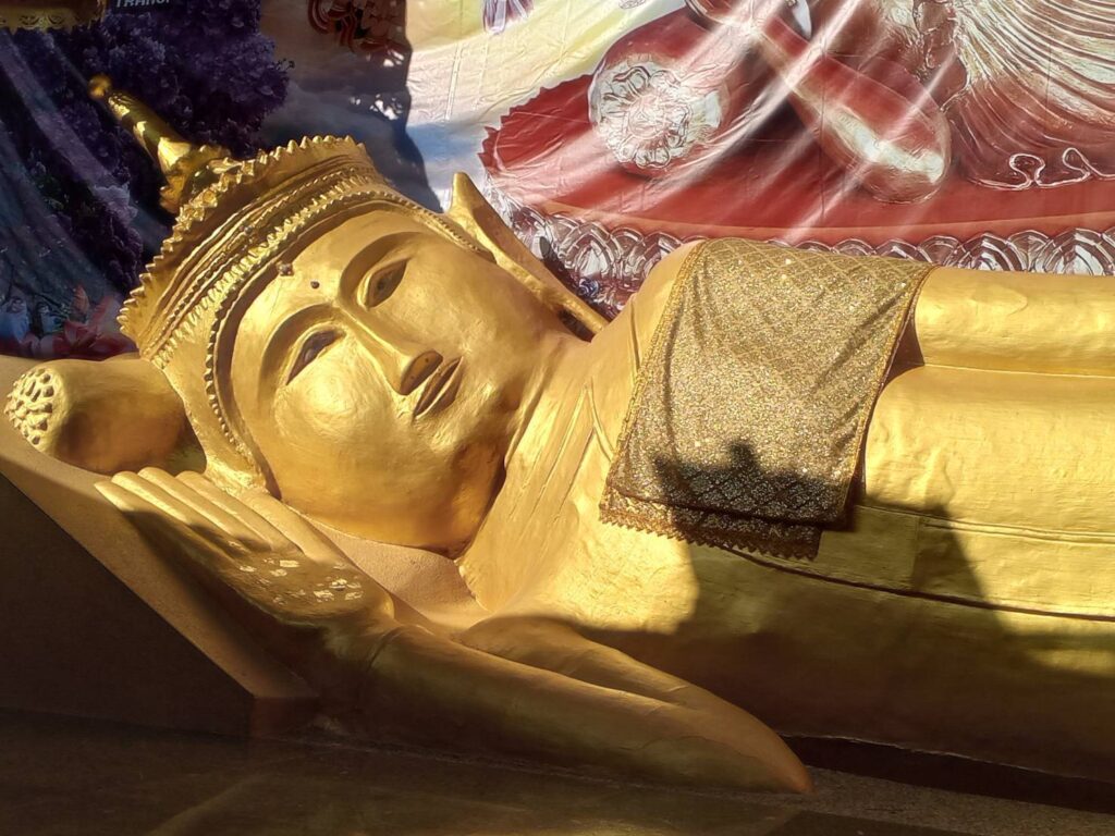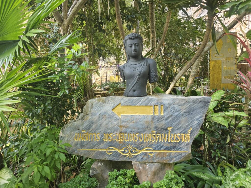 “พระพุทธสีหไสยาสน์เทริดมโนราห์ เป็นพระพุทธรูปปางปรินิพพานสมัยศรีวิชัย ความยาวกว่า 8 เมตร กว้าง 2.85 เมตร มีเอกลักษณ์คือพระเศียรสวมเทริดมโนราห์ ” ถือเป็นครั้งแรกที่เราได้เห็นพระพุทธรูปที่พระเศียรสวมเทริดมโนราห์
