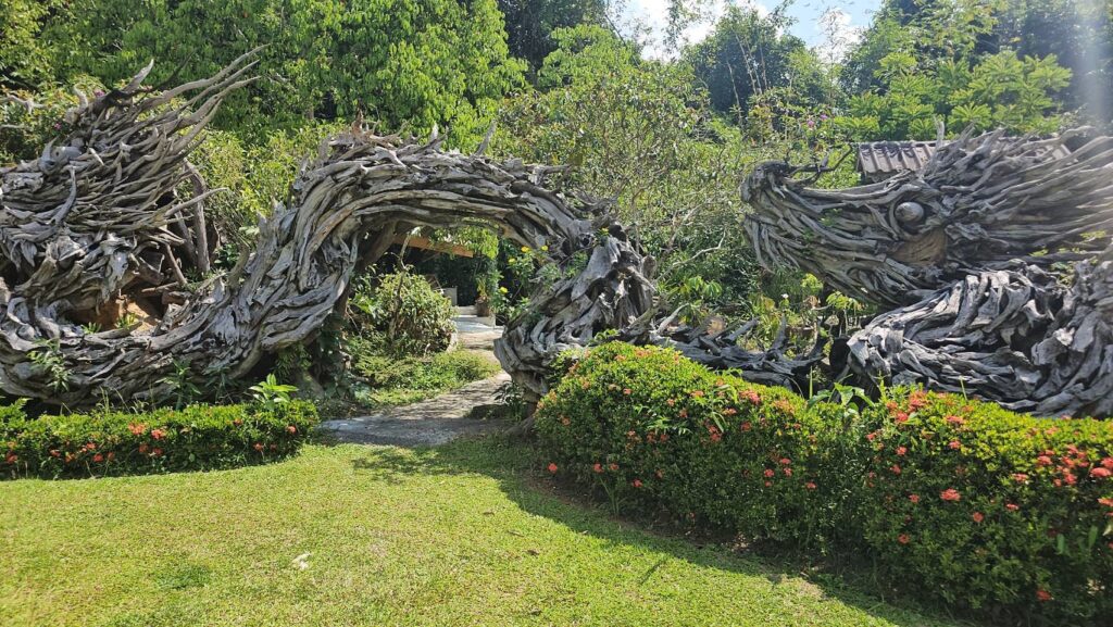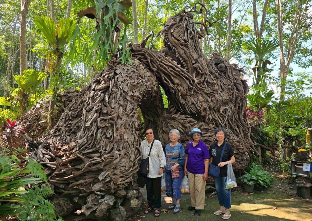 นอกจากจะเป็นการนำไม้มงคลมาขยายการเรียนรู้แล้ว ด้วยความบากบั่น เพียรนำซากไม้และราก มาสร้างเป็นมังกรหลายขนาด ตั้งแต่ตัวแรกจนถึงตัวที่ 88 โดยมังกรตัวที่ 87 เป็นมังกรแม่คือมังกรน้ำให้น้ำกับโลกมนุษย์ เพื่อไม่ให้เกิดภัยแล้ง ไม่ให้เกิดอุกภัย ส่วนมังกรตัวที่ 88 เป็นมังกรเพศผู้ เป็นมังกรไม้ที่สร้างขึ้นใหญ่ที่สุดในประเทศไทยและใหญ่ที่สุดในโลกก็ว่าได้ มังกรตัวนี้ บ่งบอกถึงพลังอำนาจของแผ่นดิน และที่ได้รับความสนใจอีกจุดหนึ่งคืออุโมงค์มังกรที่นำเลข ๙ บรรจงไว้บนเหนือหัวมังกร
