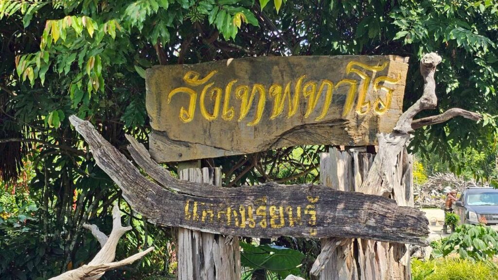 หลังสักการะองค์พระเพื่อเป็นสิริมงคล คณะของเราก็เดินทางกันต่อไปยัง วังเทพทาโร ที่ตำบลเขากอบ เป็นที่เอกชนของศิลปินพื้นบ้าน บนเนื้อที่กว่า 25 ไร่ ที่เพียรให้ความรู้แก่ผู้เข้ามาเยือนด้วยเปิดเป็นแหล่งเรียนรู้ด้านการเกษตรและปลูกต้นเทพทาโร จากน้ำพักน้ำแรงของชายที่ชื่อ จรูญ แก้วละเอียด ที่นี่มีไม้มงคลหายากของภาคใต้จัดสรรเอาไว้ให้ชมหลากหลาย