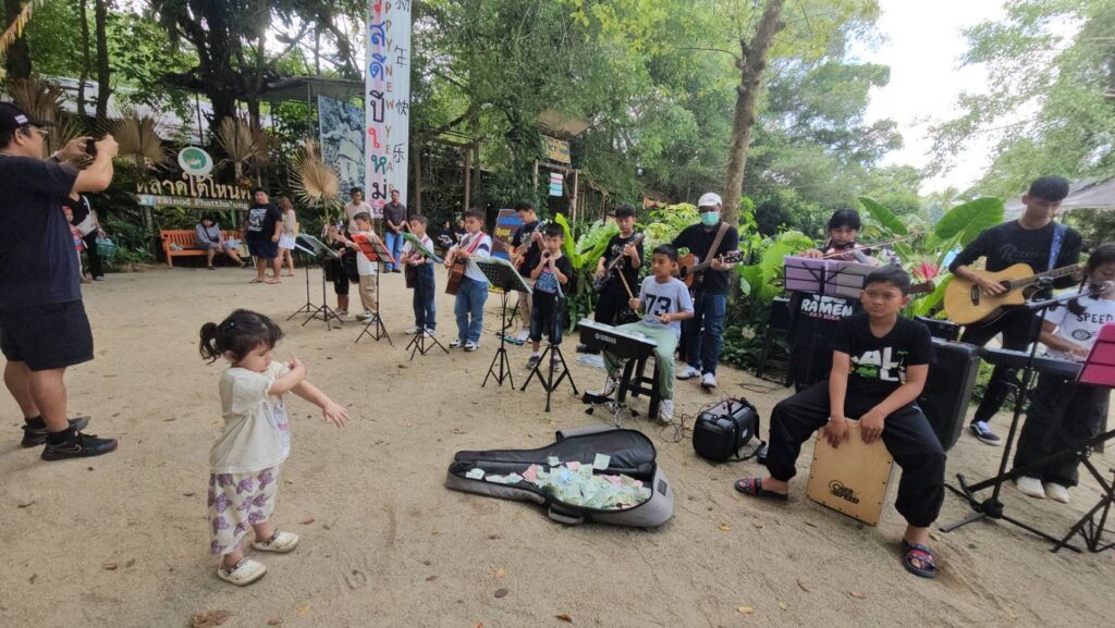 ดูเหมือนว่า ที่นี่จะถูกอกถูกใจเหล่าชาวคณะของเรามากๆ นอกจากจะมีสินค้ามากมาย ทั้งของกิน ของใช้ที่ชาวบ้านขนกันมาขาย ราคายังถูกแสนถูก ที่สำคัญยังเปิดพื้นที่ให้ คนที่มีฝีมือด้านศิลปหลากแขนง ทั้งมโนราห์ ดนตรีไทย ดนตรีสากล ดนตรีลูกทุ่ง หลากหลายรูปแบบ รวมถึงยังมีกิจกรรมสำหรับเด็ก ๆ อีกมากมายหลายอย่าง