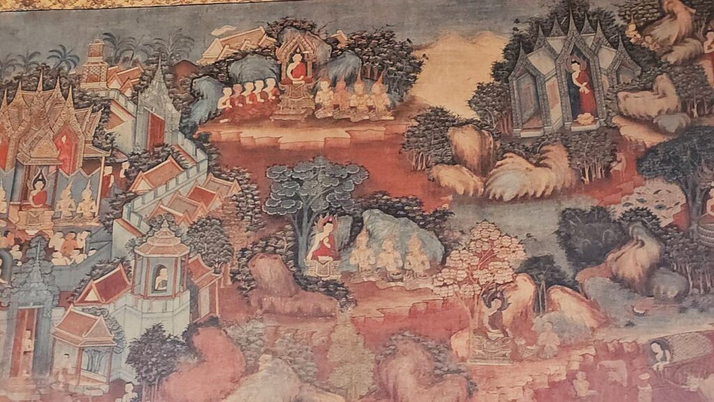 ภายในอุโบสถเป็นที่ประดิษฐานพระประธานปูนปั้นปางมารวิชัย จำนวน 4 องค์ ฝาผนังทั้ง 4 ด้าน เขียนภาพจิตรกรรม เมื่อราว พ.ศ. 2403ตรงกับสมัยรัชกาลที่ 4 เป็นการเล่าเรื่องพุทธประวัติและเทพชุมนุม ซึ่งหลวงพ่อก็ได้บรรยายให้กับเราฟังอย่างละเอียดในแต่ละผนัง ด้วยเพราะอากาศภายในโบสถ์ที่เย็นสบาย หลายคนฟังไปเคลิ้มไป