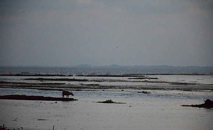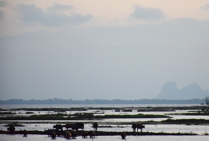และปิดท้ายวันด้วยที่เที่ยวสุดท้ายของวัน คราวนี้ไปยังสะพานข้ามทะเลสาบที่ยาวที่สุดในประเทศไทยที่มีความยาวถึงประมาณ 5.5 กม. เชื่อมระหว่างทะเลน้อย อ.ควนขนุน จ.พัทลุง กับ อ.ระโนด จ.สงขลา เพื่อไปดูควายน้ำกัน กว่าจะถึงก็อาทิตย์ใกล้ตกเต็มที ได้แค่ลงไปถ่ายภาพกันนิดหน่อย ๆ ก็ต้องวิ่งกลับมา แต่ก็ยังพอได้เห็นเจ้าควายน้อยในปรักที่อยู่กลางเนินดินริมน้ำบ้าง ก่อนอาทิตย์จะลับเหลี่ยมฟ้ามืดลง