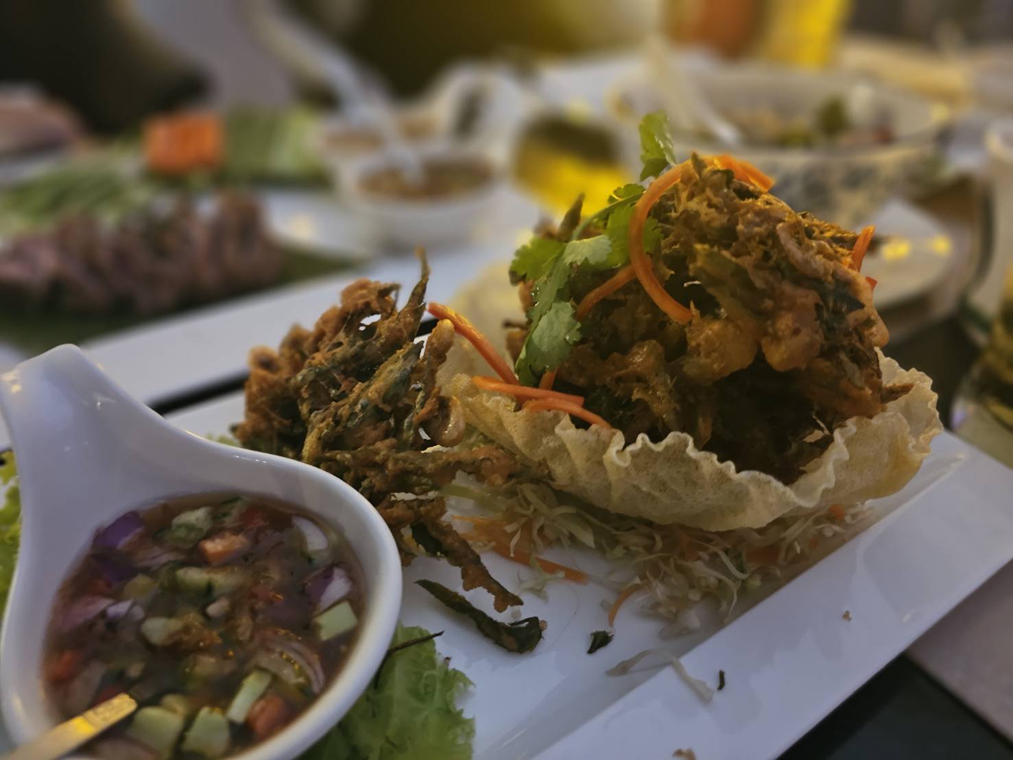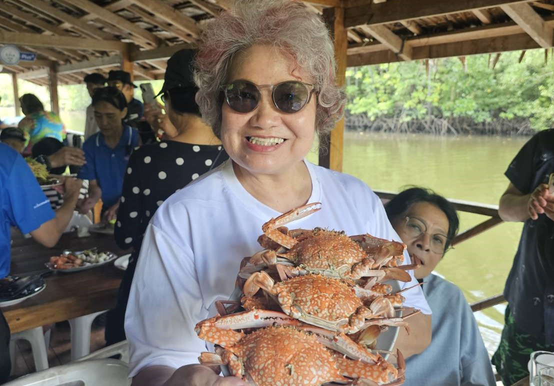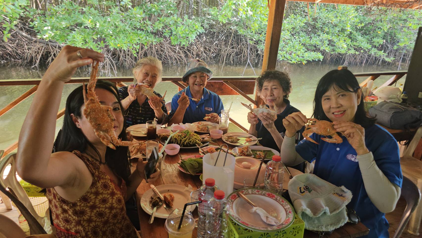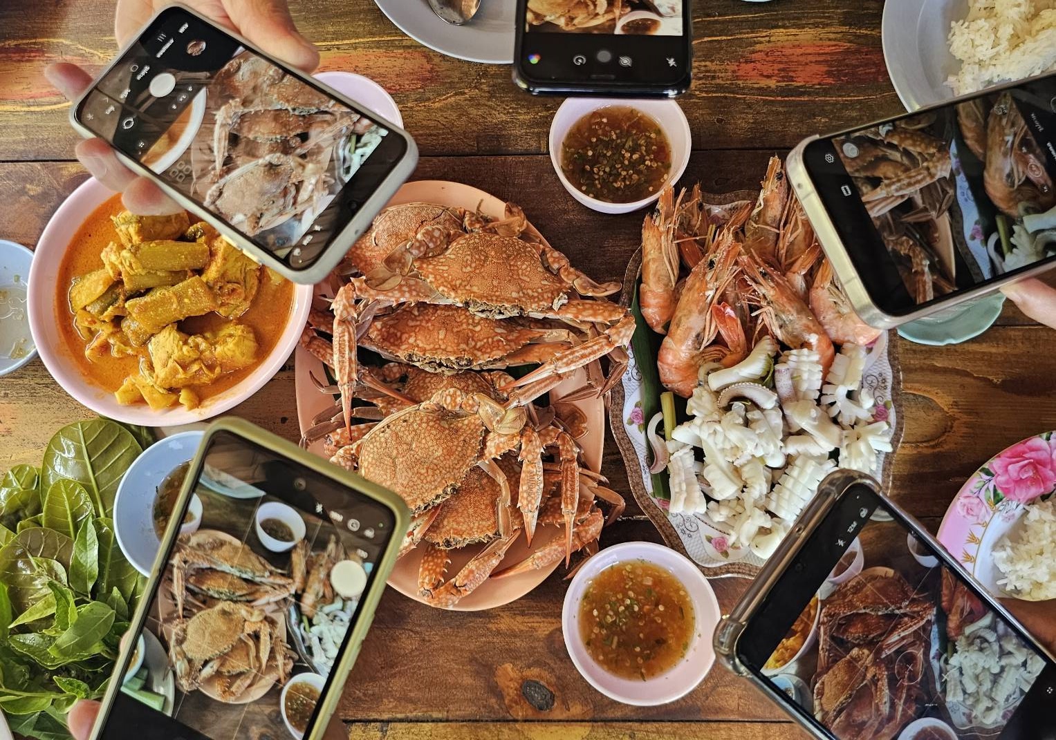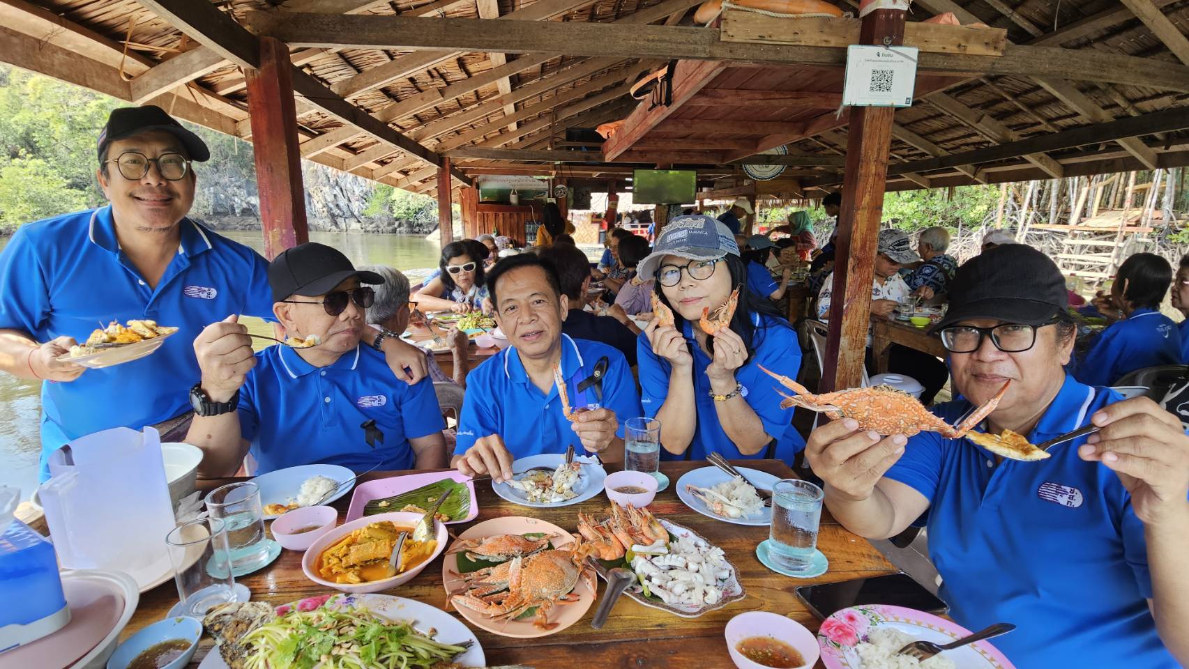 ทางแพท่องเที่ยวจัดที่นั่งสำหรับทานอาหารโต๊ะละ 8 คน อาหารทะเลสดๆ ทยอยมาจานแล้วจานเล่า ไม่ว่าจะเป็น ปู กุ้ง หอย ปลาหมึก แกงใต้ น้ำพริกพร้อมผักแซม ปลาทอด หรือแม้แต่ไข่เจียว