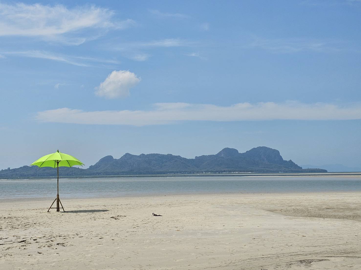 “ร่มใหม่ครับ คันเก่าสีหมองแล้ว คันนี้ต้อนรับคณะนี้กันเลยครับ” คุณลุงคนแพ แบกร่มคันโตสีเขียวแปร๊ดไปปักกลางเกาะทะเลแหวก ฟ้าสีคราม น้ำสีเข้ม ร่มสีเขียว มันช่างสดใสเสียจริง ๆ