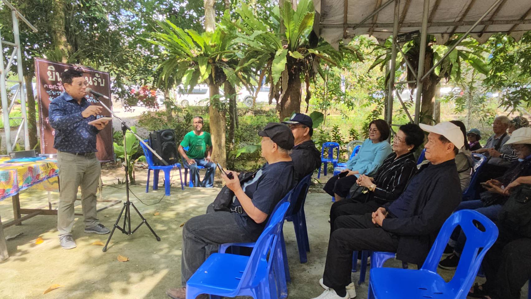 อ.เจน สงสมพันธ์ ประธานกรรมการ “หลาดใต้โหนด” ตั้งโต๊ะให้การต้อนรับคณะ พร้อมกับเล่าถึงความเป็นมาของหลาดใต้โหนดว่า “ เป็นโครงการ บ้านนักเขียน โดย กนกพงศ์ สงสมพันธุ์ นักเขียนรางวัลซีไรท์จากรวมเรื่องสั้น แผ่นดินอื่น เมื่อปี 2539 ซึ่งเสียชีวิตเมื่อปี 2549 ส่วนโครงการนี้ตั้งอยู่บนพื้นที่ประมาณสิบไร่ เป็นที่นาเก่าที่ทิ้งรกร้างมากว่ายี่สิบปี ปี 2558 เพิ่มโครงการตลาดเพื่อชุมชน
