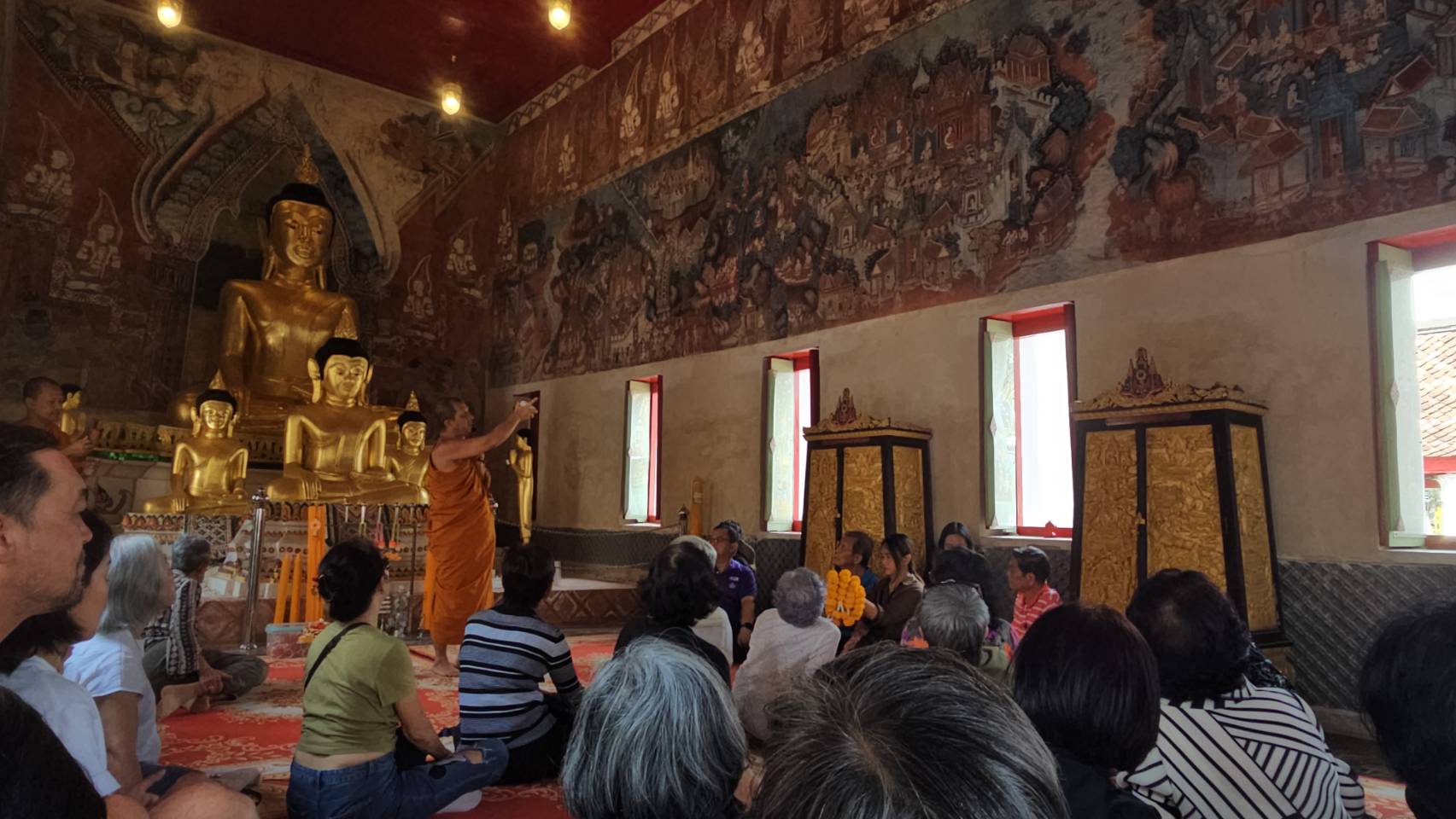 ภายในอุโบสถเป็นที่ประดิษฐานพระประธานปูนปั้นปางมารวิชัย จำนวน 4 องค์ ฝาผนังทั้ง 4 ด้าน เขียนภาพจิตรกรรม เมื่อราว พ.ศ. 2403ตรงกับสมัยรัชกาลที่ 4 เป็นการเล่าเรื่องพุทธประวัติและเทพชุมนุม ซึ่งหลวงพ่อก็ได้บรรยายให้กับเราฟังอย่างละเอียดในแต่ละผนัง ด้วยเพราะอากาศภายในโบสถ์ที่เย็นสบาย หลายคนฟังไปเคลิ้มไป