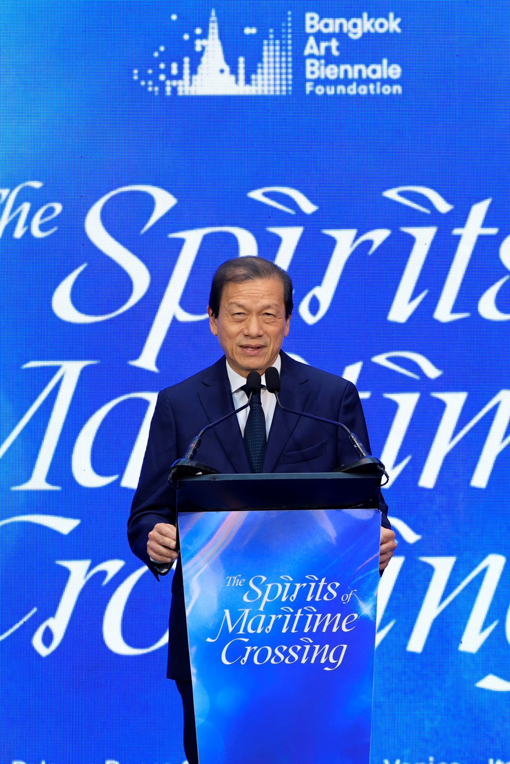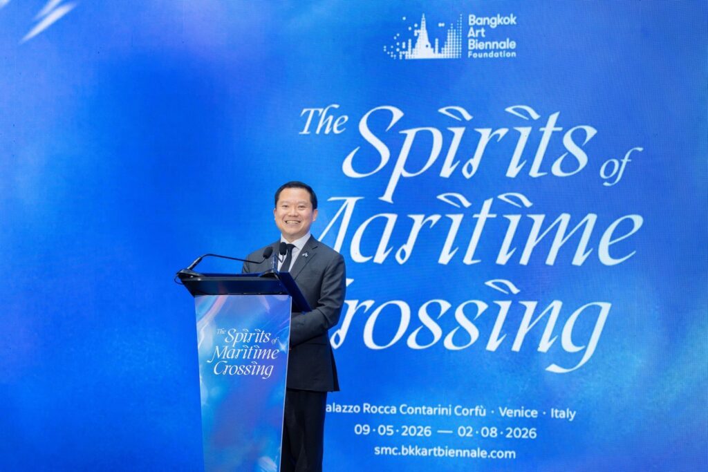 คุณฐาปน สิริวัฒนภักดี ประธานเจ้าหน้าที่บริหาร บริษัท ไทยเบฟเวอเรจ จำกัด (มหาชน) และประธานกรรมการ และผู้ก่อตั้งมูลนิธิ บางกอก อาร์ต เบียนนาเล่ กล่าวว่า “ผมรู้สึกยินดี และเป็นเกียรติอย่างยิ่งที่ทุกท่านกรุณาให้เกียรติมาร่วมงานแถลงข่าว “The Spirits of Maritime Crossing : วิญญาณข้ามมหาสมุทร 2026″ ที่จะจัดขึ้นระหว่างวันที่ 9 พฤษภาคม – 2 สิงหาคม 2569 ณ นครเวนิส สาธารณรัฐอิตาลี ในช่วงเวลาเดียวกันกับ มหกรรมศิลปะนานาชาติ เวนิส เบียนนาเล่ ครั้งที่ 61 (The 61th International Art Exhibition, Venice Biennale)