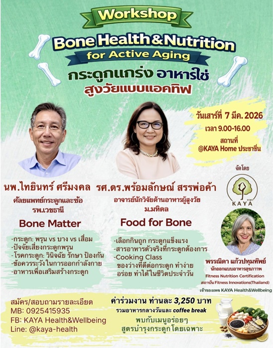 KAYA Health & Wellbeing โดย พรรณิดา แก้วปทุมทิพย์ นักออกแบบอาหารสุขภาพ ขอเชิญผู้สนใจเรื่องการดูแลสุขภาพด้วยอาหาร โดยเฉพาะผู้สูงวัยและผู้ที่ต้องดูแลผู้สูงวัย มาหาคำตอบพร้อมลิ้มรสเมนูอร่อยๆ สูตรบำรุงกระดูกโดยเฉพาะ ในเวิร์คช็อป “Bone Health & Nutrition for Active Aging : กระดูกแกร่ง อาหารใช่ สูงวัยแบบแอคทีฟ” กับ 2 วิทยากรตัวจริงสายสุขภาพ