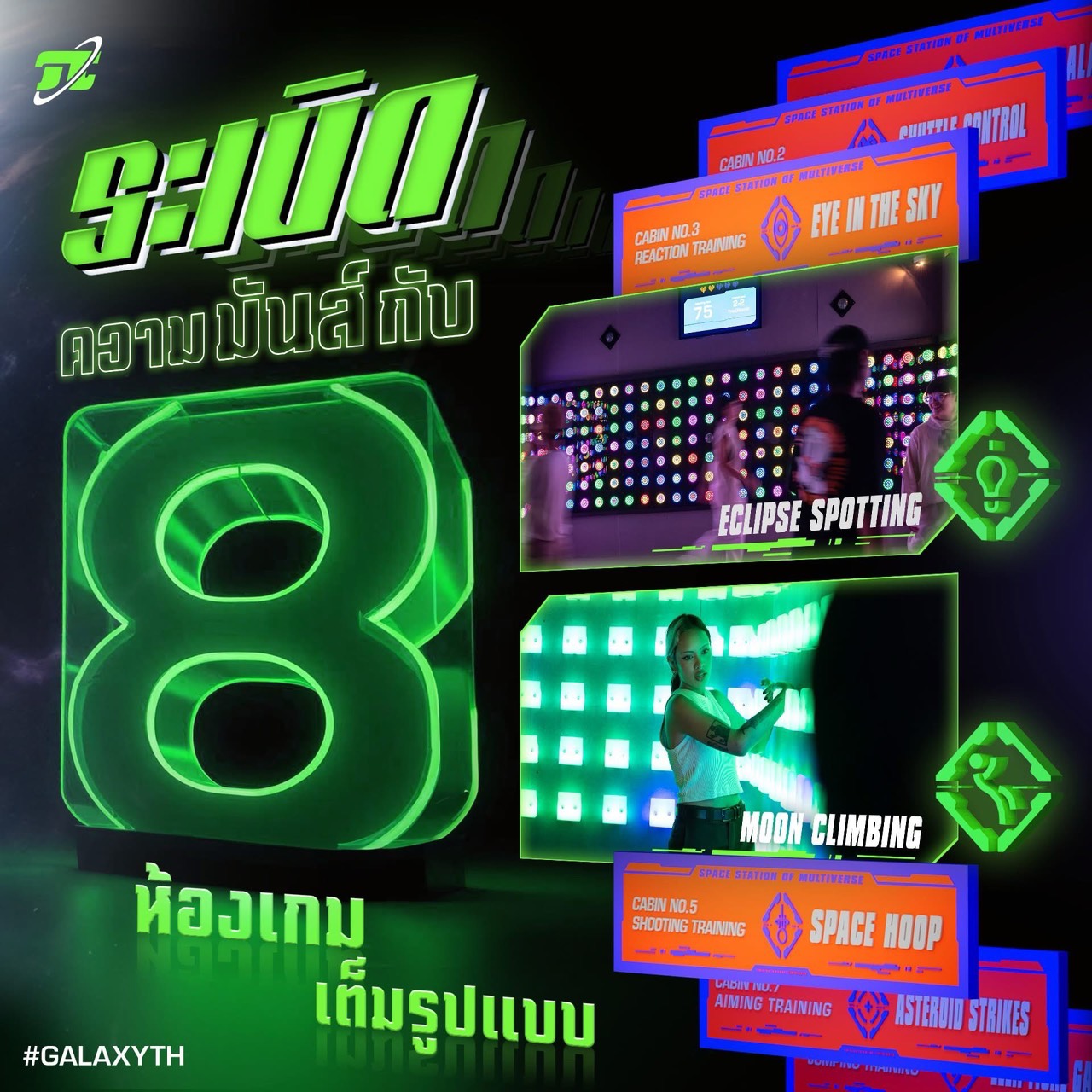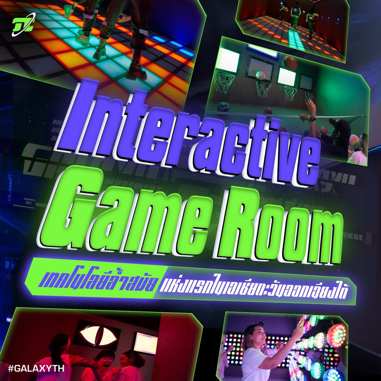 เหล่าเกมเมอร์ที่ชื่นชอบความท้าทายและรักการแข่งขัน หลงใหลในธีม Sci-Fi ชวนมาร่วมผจญภัยสุดมันส์ทะยานสู่จักรวาลความสนุก สัมผัสเทคโนโลยีล้ำสมัยแห่งแรกในเอเชียตะวันออกเฉียงใต้ ที่ GALAXY ห้องเกมแบบ Interactive Game Room ให้เหล่าเกมเมอร์ได้ร่วมพิชิตความท้าทายหลากหลายรูปแบบ เปิดประสบการณ์ความสนุกไร้ขีดจำกัดกับ 8 ห้องเกมสุดมันส์ที่เต็มไปด้วยภารกิจท้าทายทั้งฝึกสมอง ประลองความไว และทดสอบความแข็งแกร่งของร่างกาย อาทิ ห้อง Elliptical Galaxy พื้นลาวาเดือด! กระโดดให้ไว สังเกตให้แม่น เกมที่ต้องใช้ทักษะการกระโดด การสังเกต และความไวขั้นเทพ พื้นลาวาที่ไม่เคยหยุดนิ่ง และต้องทำทุกวิถีทางเพื่อเอาตัวรอด เหยียบช่องสีฟ้าเพื่อเก็บแต้มและห้ามเหยียบช่องสีแดงเด็ดขาด ถ้าไม่อยากจบเกมเร็ว
