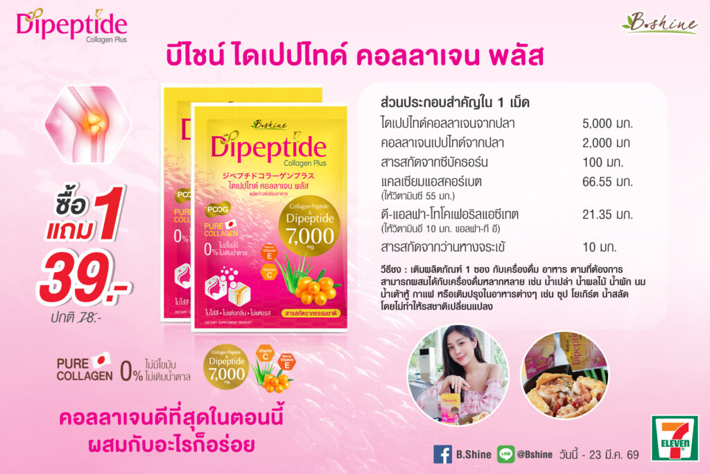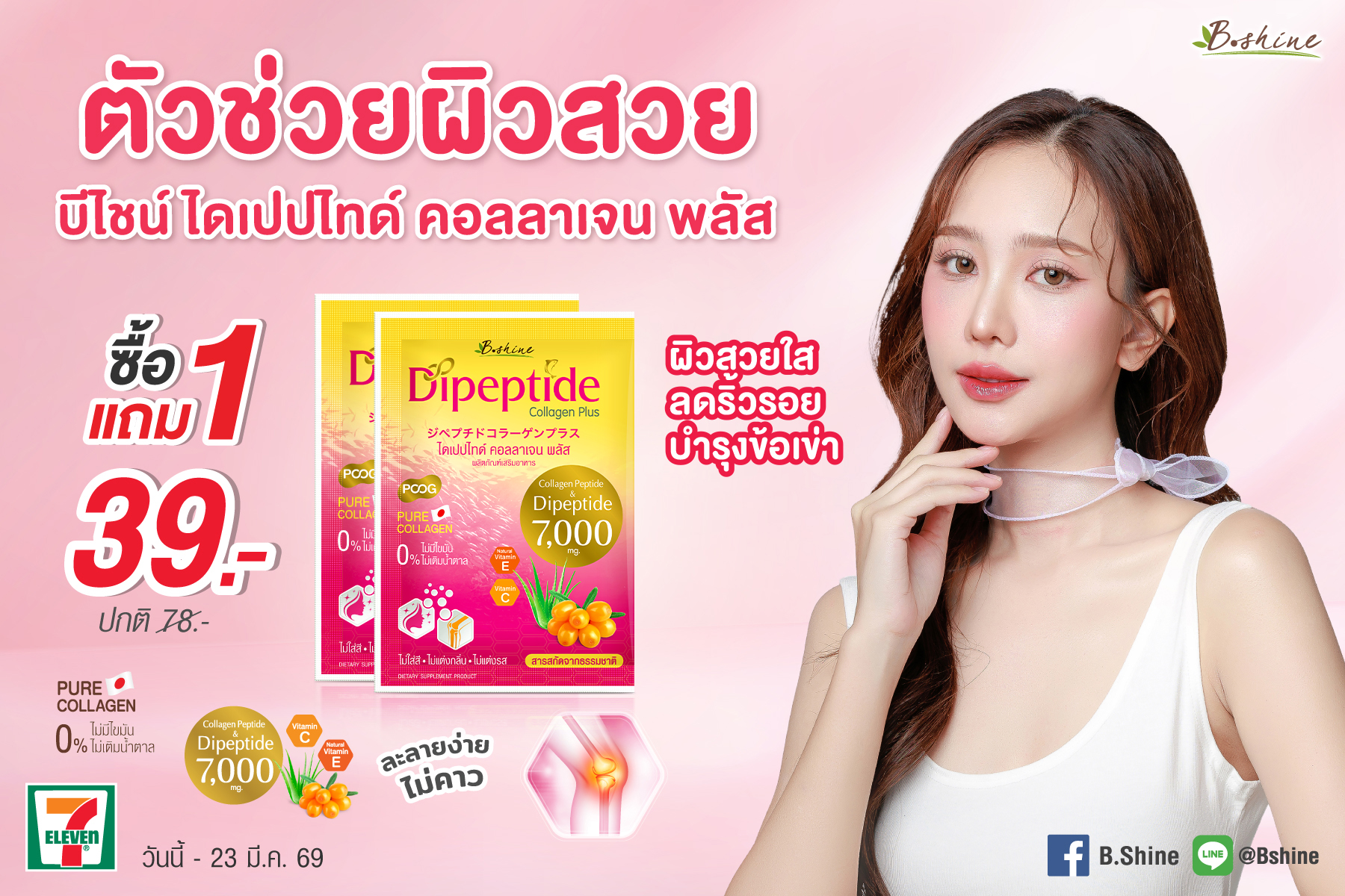 โปรโมชั่นสุดคุ้มที่คุณห้ามพลาด! บีไชน์จัดหนักให้คุณดูแลตัวเองได้ง่ายขึ้นกับโปรโมชั่น “บีไชน์ ไดเปปไทด์ คอลลาเจน พลัส” ขนาดซองบรรจุ 7,200 มิลลิกรัม ซื้อ 1 แถม 1 ในราคาพิเศษเพียง 39 บาท (จากราคาปกติ 78 บาท) และสิทธิพิเศษเฉพาะสมาชิก All Member ลดเพิ่มอีก 1 บาท เหลือเพียง 38 บาท หาซื้อได้ตั้งแต่วันนี้ – 23 มีนาคม 2569 ที่ร้านเซเว่น อีเลฟเว่น ใกล้บ้านคุณ