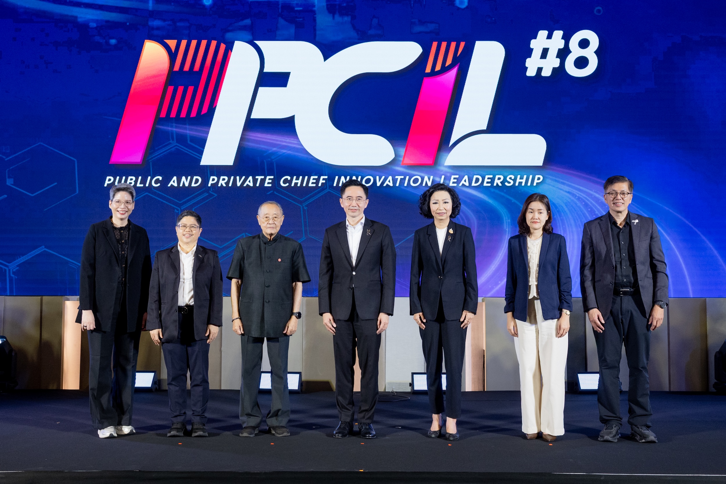 ศาสตราจารย์ ดร.ยศชนัน วงศ์สวัสดิ์ รองนายกรัฐมนตรี และรัฐมนตรีว่าการกระทรวงการอุดมศึกษา วิทยาศาสตร์ วิจัยและนวัตกรรม (อว.) (ลำดับที่ 4 จากซ้าย) ดร.สุเมธ ตันติเวชกุล กรรมการและที่ปรึกษาพิเศษอาวุโสมูลนิธิชัยพัฒนา (ลำดับที่ 3 จากซ้าย) และ ดร.กริชผกา บุญเฟื่อง ผู้อำนวยการสำนักงานนวัตกรรมแห่งชาติ NIA (ลำดับที่ 2 จากซ้าย) ร่วมเปิดหลักสูตรอบรมเชิงปฏิบัติการเพื่อพัฒนาขีดความสามารถด้านนวัตกรรมสำหรับกลุ่มผู้นำรุ่นใหม่ภาครัฐและเอกชน (Public and Private Chief Innovation Leadership: PPCIL) ที่จัดขึ้นต่อเนื่องเป็นปีที่ 8 เพื่อพัฒนาทักษะสำหรับกลุ่มผู้นำที่มีศักยภาพในการออกแบบนวัตกรรมเชิงนโยบาย และสร้างเครือข่ายความร่วมมือเชิงระบบในการขับเคลื่อนประเทศไทยสู่การเพิ่มความสามารถด้านการแข่งขันที่ยั่งยืน เมื่อเร็ว ๆ นี้ ณ ห้องอีเทอร์นิตี้ บอลรูม (Eternity Ballroom) โรงแรมพูลแมน คิง เพาเวอร์ กรุงเทพฯ