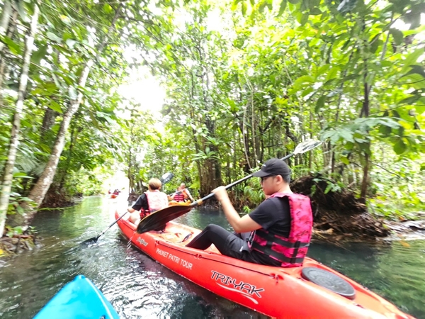 ... และด้วยคราวก่อนที่เราเลือกจะพายคายัคด้วยตนเองออกแรงไปพร้อมกับเพื่อนคู่ใจ ก็ทำเอาสะบักสะบอมพอสมควร ไหนจะต้องถ่ายภาพ ไหนจะต้องพยุงคายัคไม่ให้ชนกับต้นไม้และตอผุดใต้น้ำที่มีอยู่เป็นจำนวนมาก ไหนจะนานๆ พายก็คัดซ้ายที.. คัดขวาที... ขึ้นไปอยู่บนตอมั่ง มุดเข้ารกเข้าพงมั่ง ครั้งนี้รู้ชะตากรรมเลยต้องขอเจ้าหน้าที่ช่วยพายให้หน่อยเหอะ ก็ต้องขอบคุณหนุ่มน้อยนักเรียนจากโรงแรมแถวๆ นี้มาพายเรือให้ .. สบายไป การพายเรือคายัค มีค่าบริการการเช่าเรือลำละ 300 บาทนั่งได้ 1-3 คนและเริ่มต้นจากคลองหรูดถึงบ่อน้ำผุด ใช้เวลาประมาณ 40 ถึง 1 ชั่วโมง