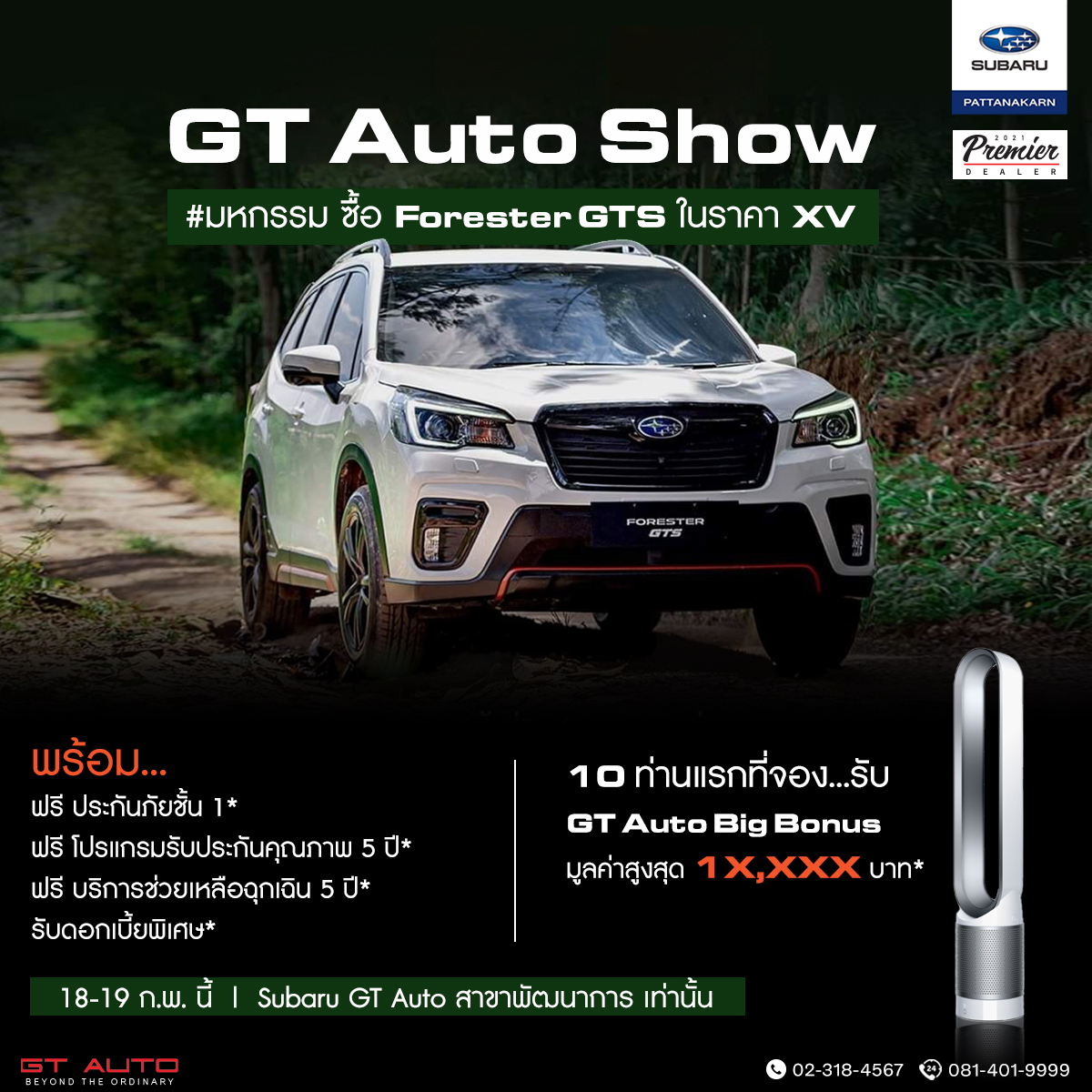 GT Auto ผู้แทนจำหน่ายรถยนต์ Subaru อย่างเป็นทางการ คว้าตำแหน่งผู้นำอันดับ 1 ของผู้แทนจำหน่ายที่มียอดขายสูงสุดของประเทศไทยเป็นปีที่ 3 ติดต่อกัน ตอกย้ำภาพเป็นผู้นำจัดงาน มหกรรม GT Auto Show มอบข้อเสนอสุดพิเศษแห่งปีก่อนใคร สำหรับผู้ซื้อรถยนต์ Subaru Forester GTS ระหว่างวันที่ 18-19 กุมภาพันธ์ 2566 นี้ ณ โชว์รูม Subaru GT Auto สาขาพัฒนาการ